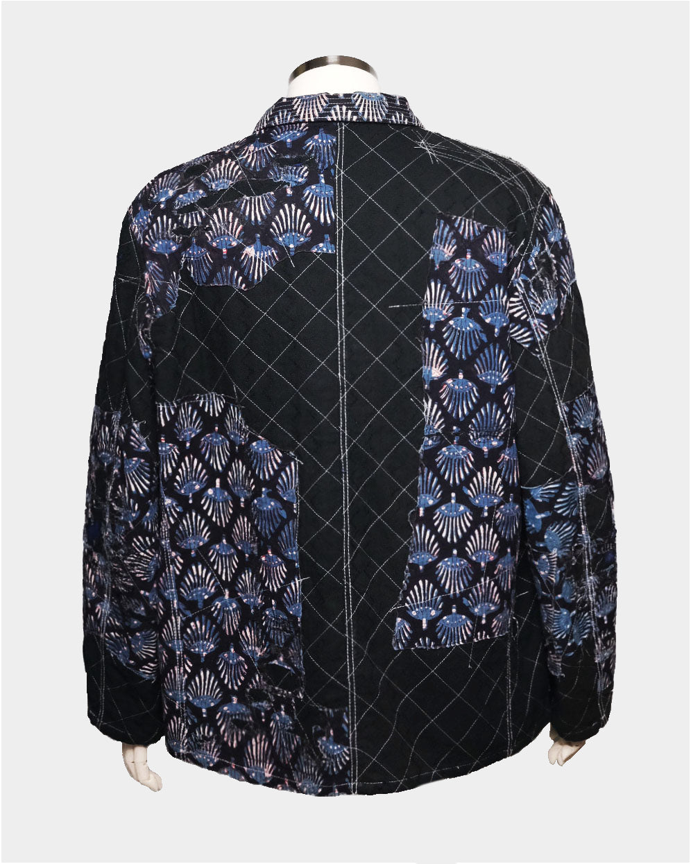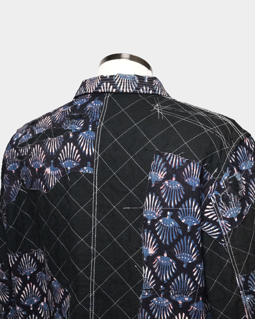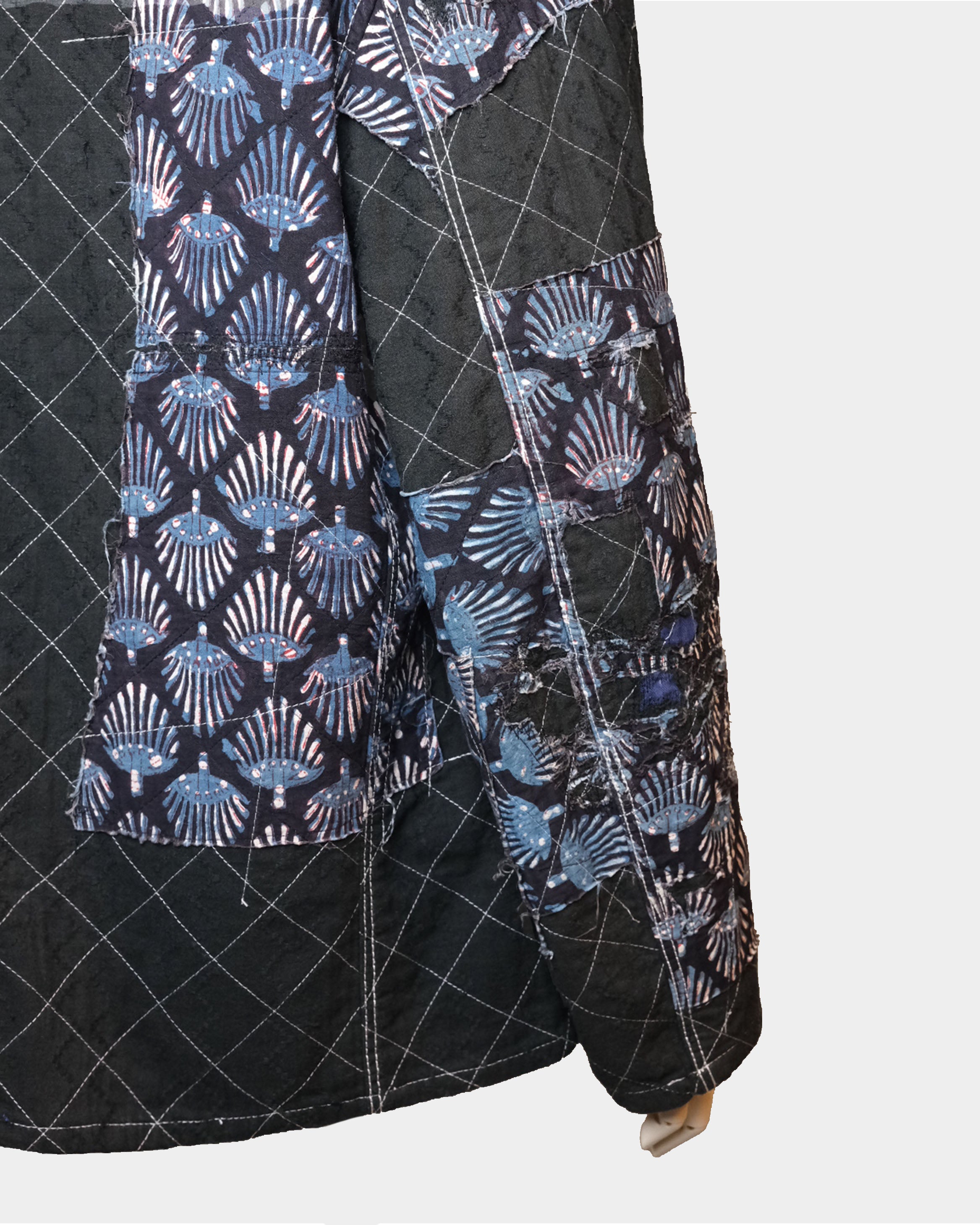 インドで織られた黒のドビーの生地と、葉脈のブロックプリントの生地を叩きつけた素材。