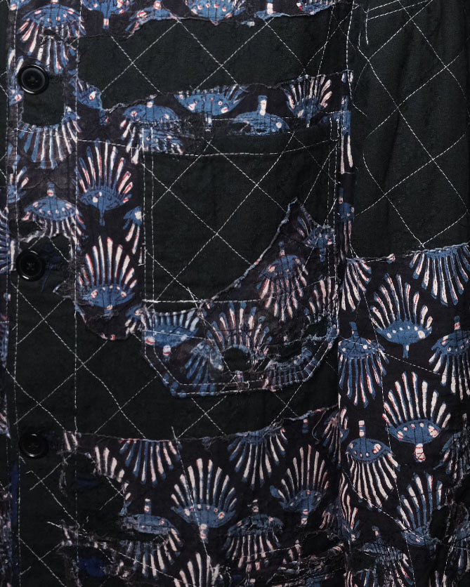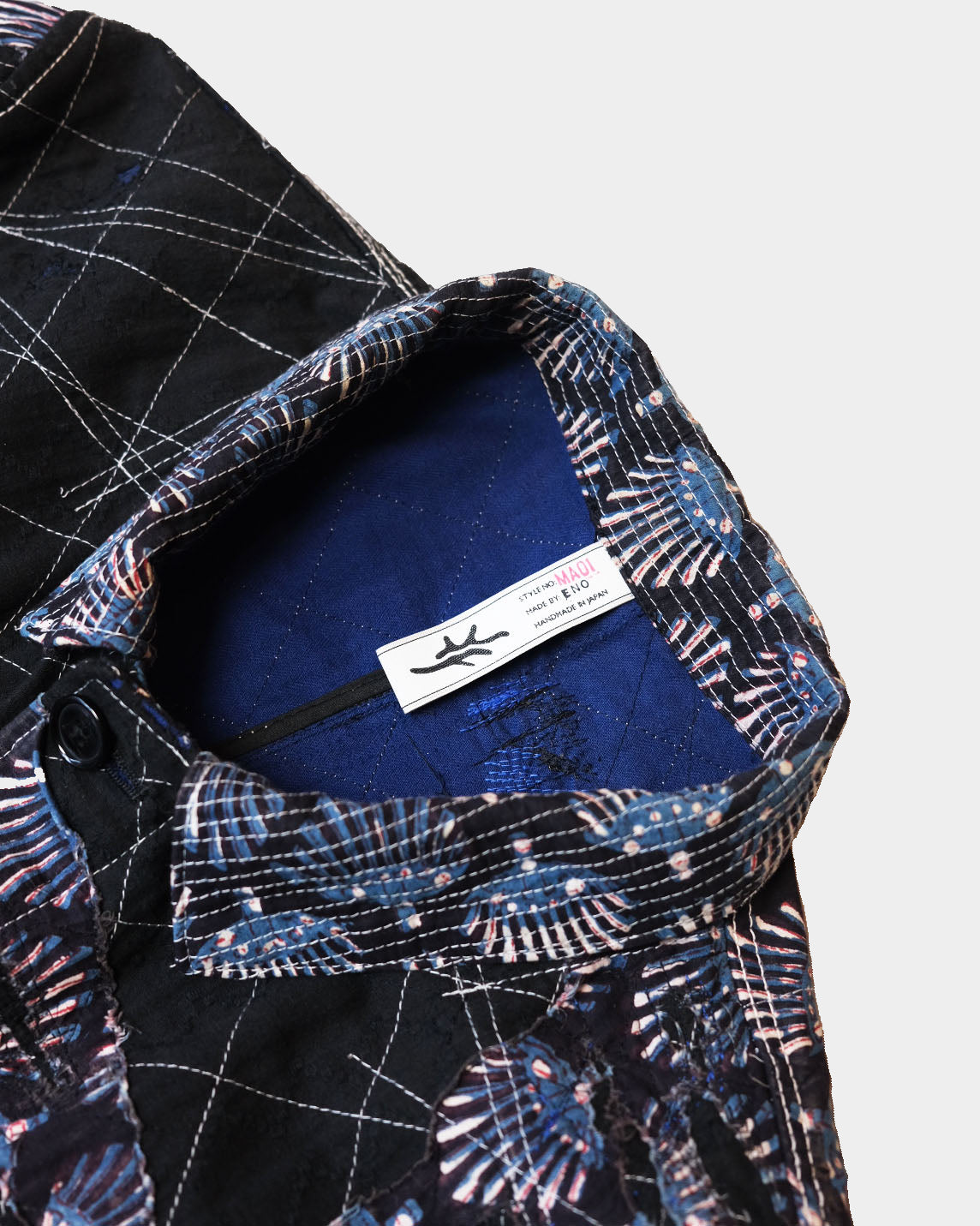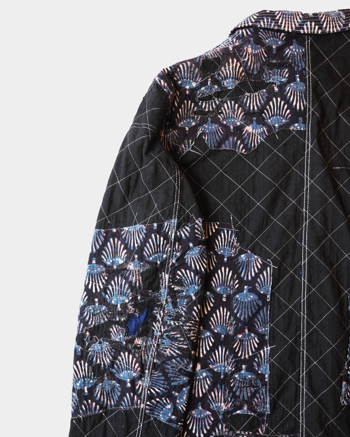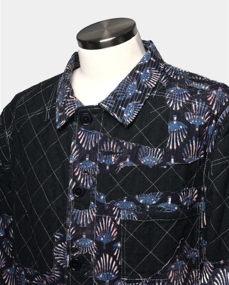 インドで織られた黒のドビーの生地と、葉脈のブロックプリントの生地を叩きつけた素材。