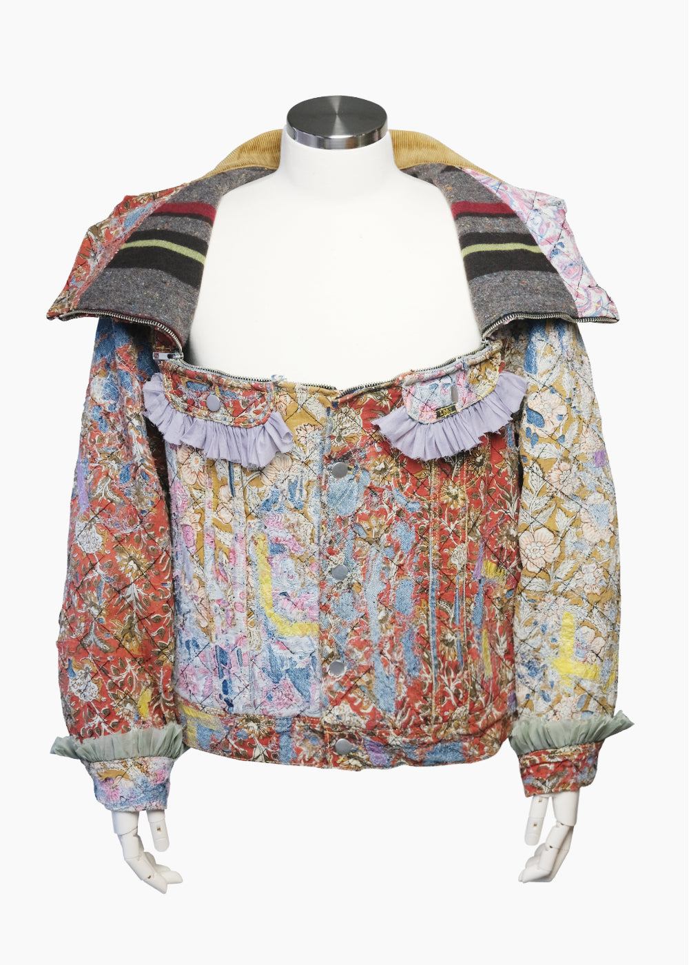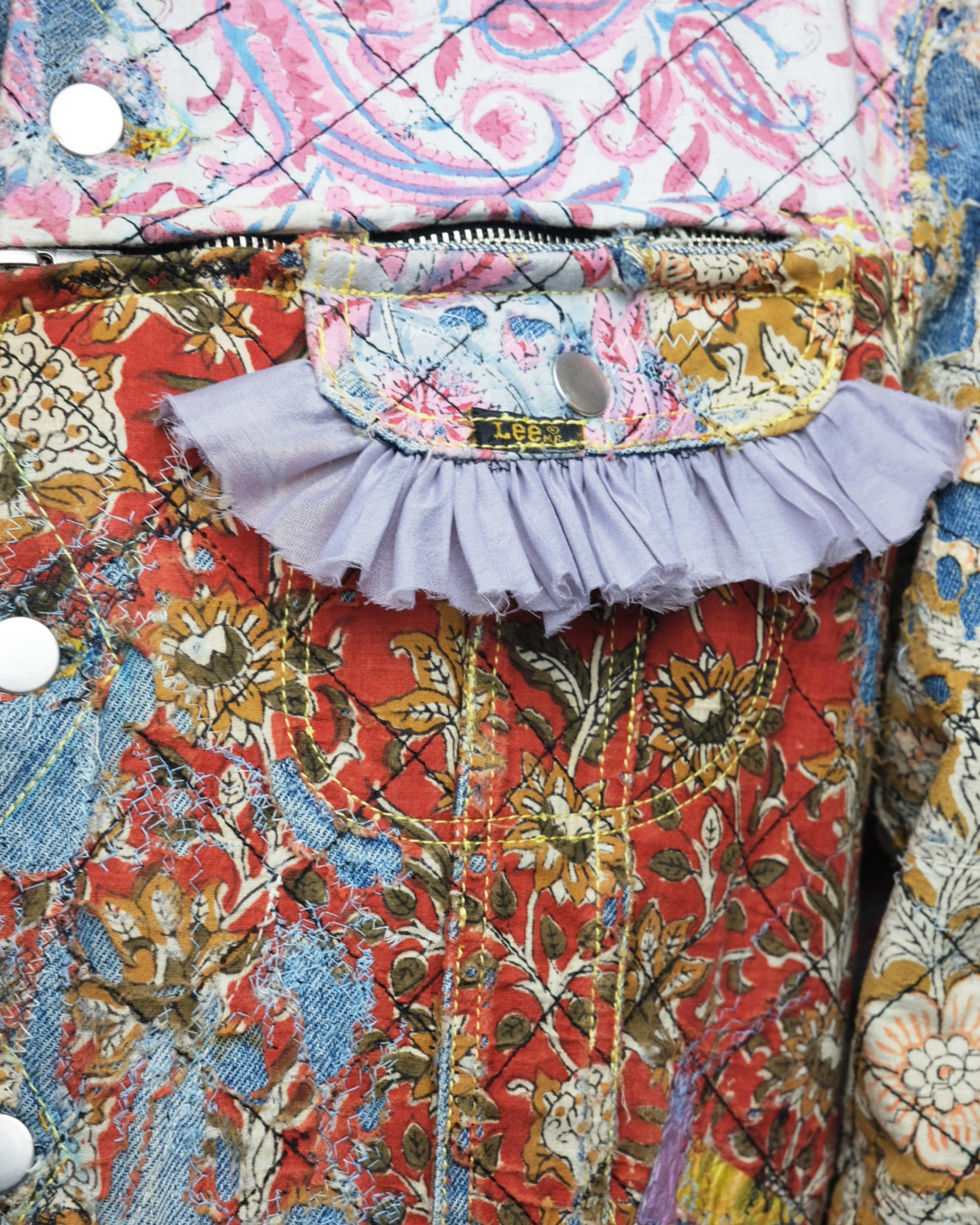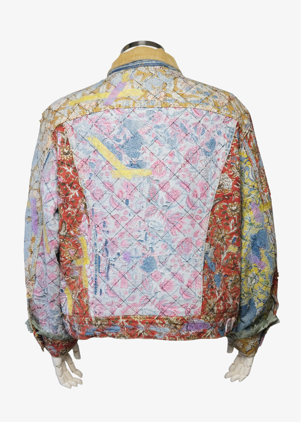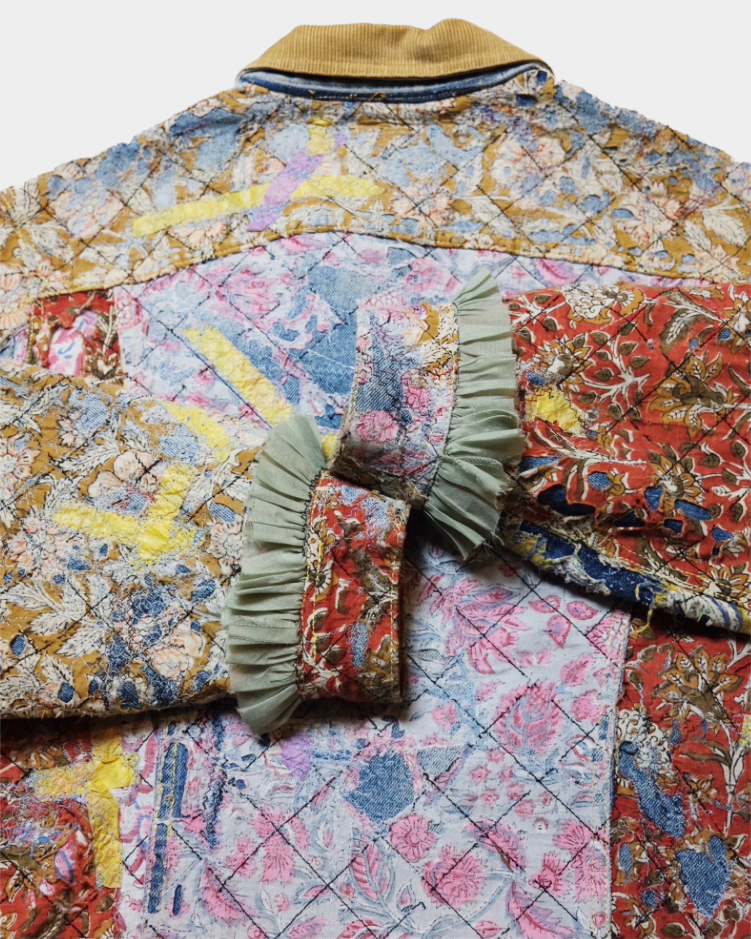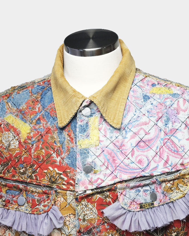 表面全体にクロスステッチを施しています。裏地のブランケット素材は身頃の色に合わせた新しい色の裏地へ変更、また、袖裏の裏地もオリジナルから変更。 ブロックプリントの布を配置した一着。