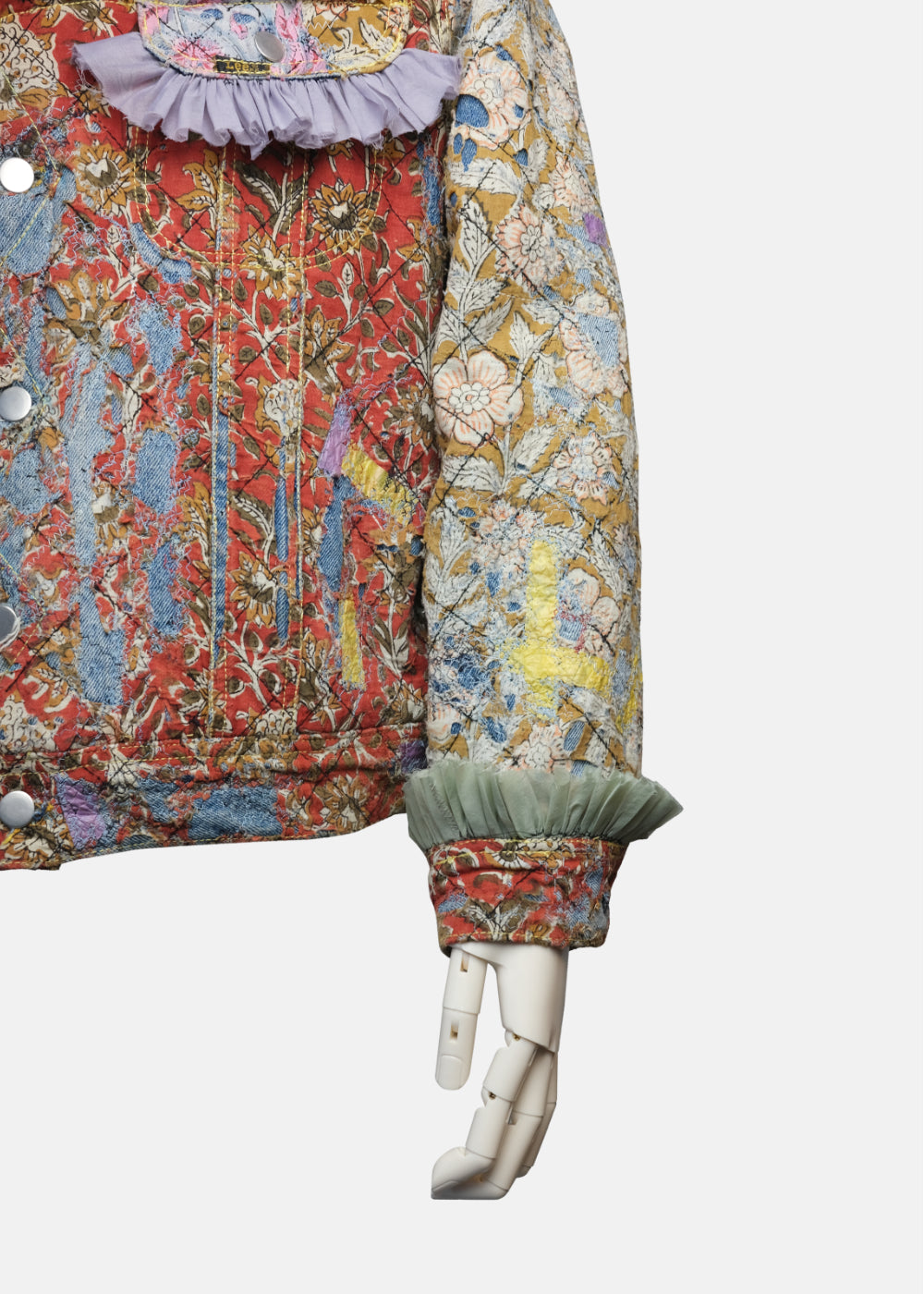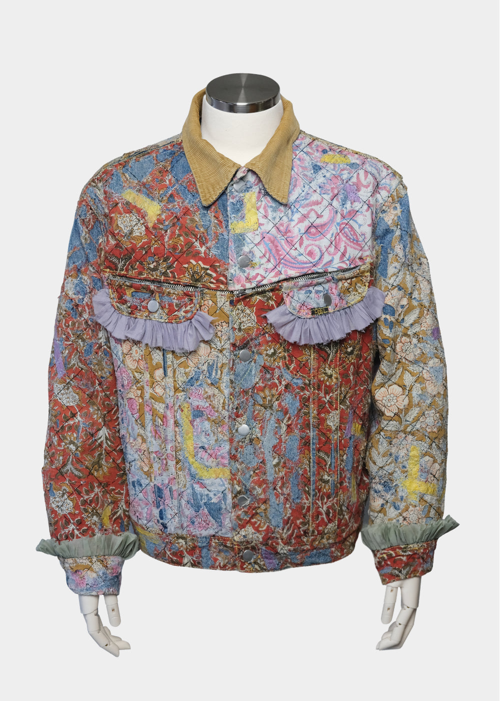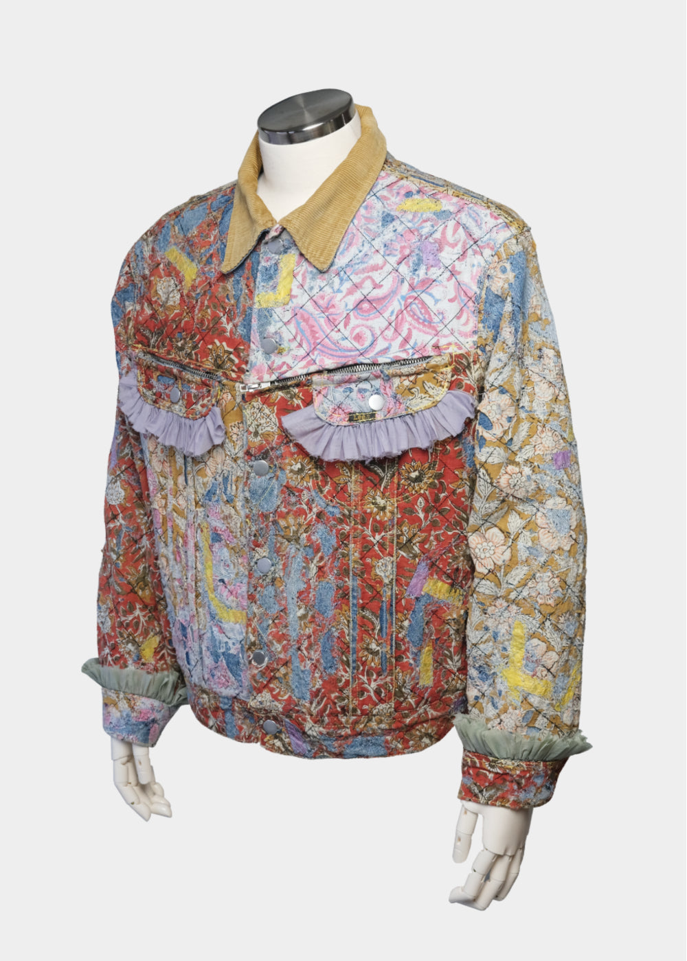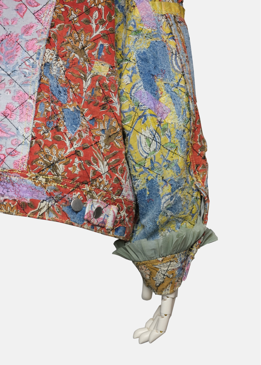 表面全体にクロスステッチを施しています。裏地のブランケット素材は身頃の色に合わせた新しい色の裏地へ変更、また、袖裏の裏地もオリジナルから変更。 ブロックプリントの布を配置した一着。